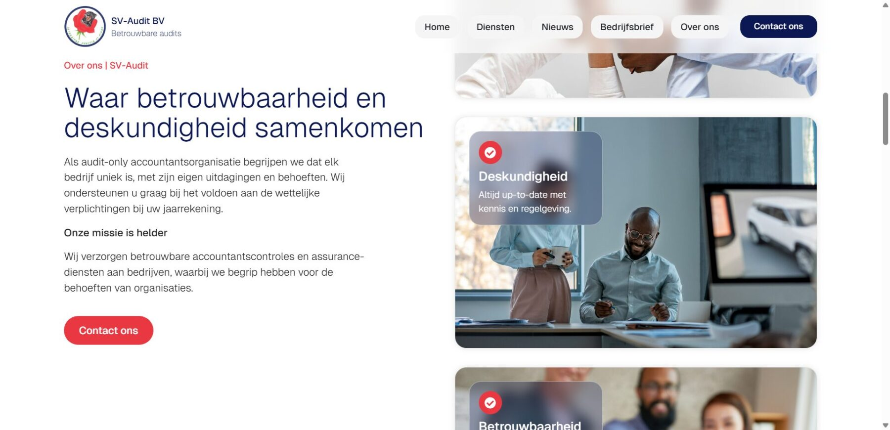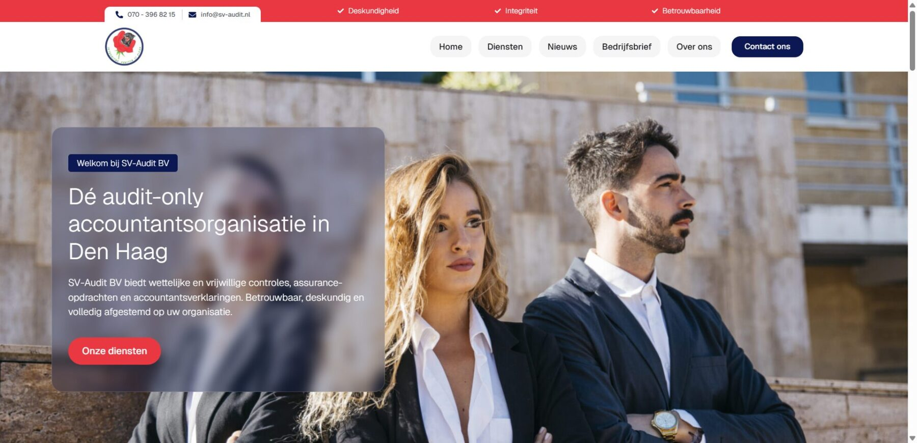 Voor SV-Audit BV hebben wij de website volledig opnieuw ontworpen en ontwikkeld, met als doel een moderne en professionele uitstraling die aansluit bij hun kernwaarden.